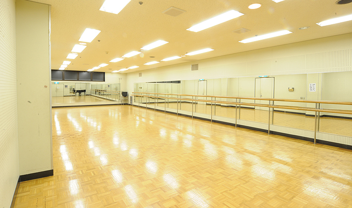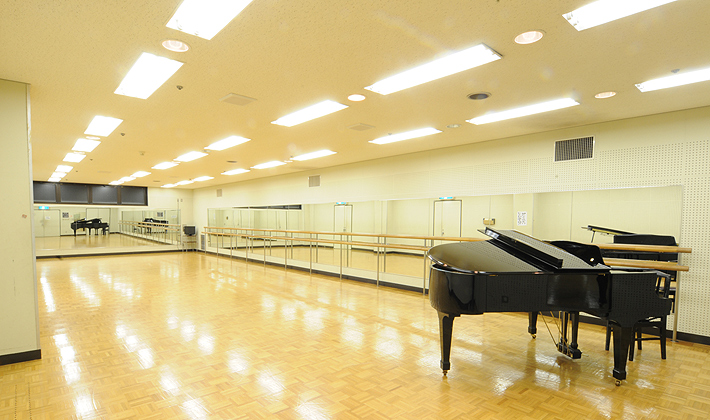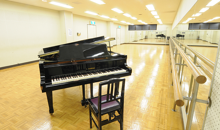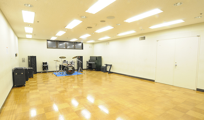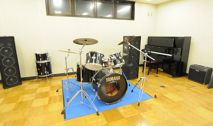 リハーサル室は鏡、レッスンバー完備。音楽練習室はドラムセット、各種アンプ類の貸し出しも行なっています。